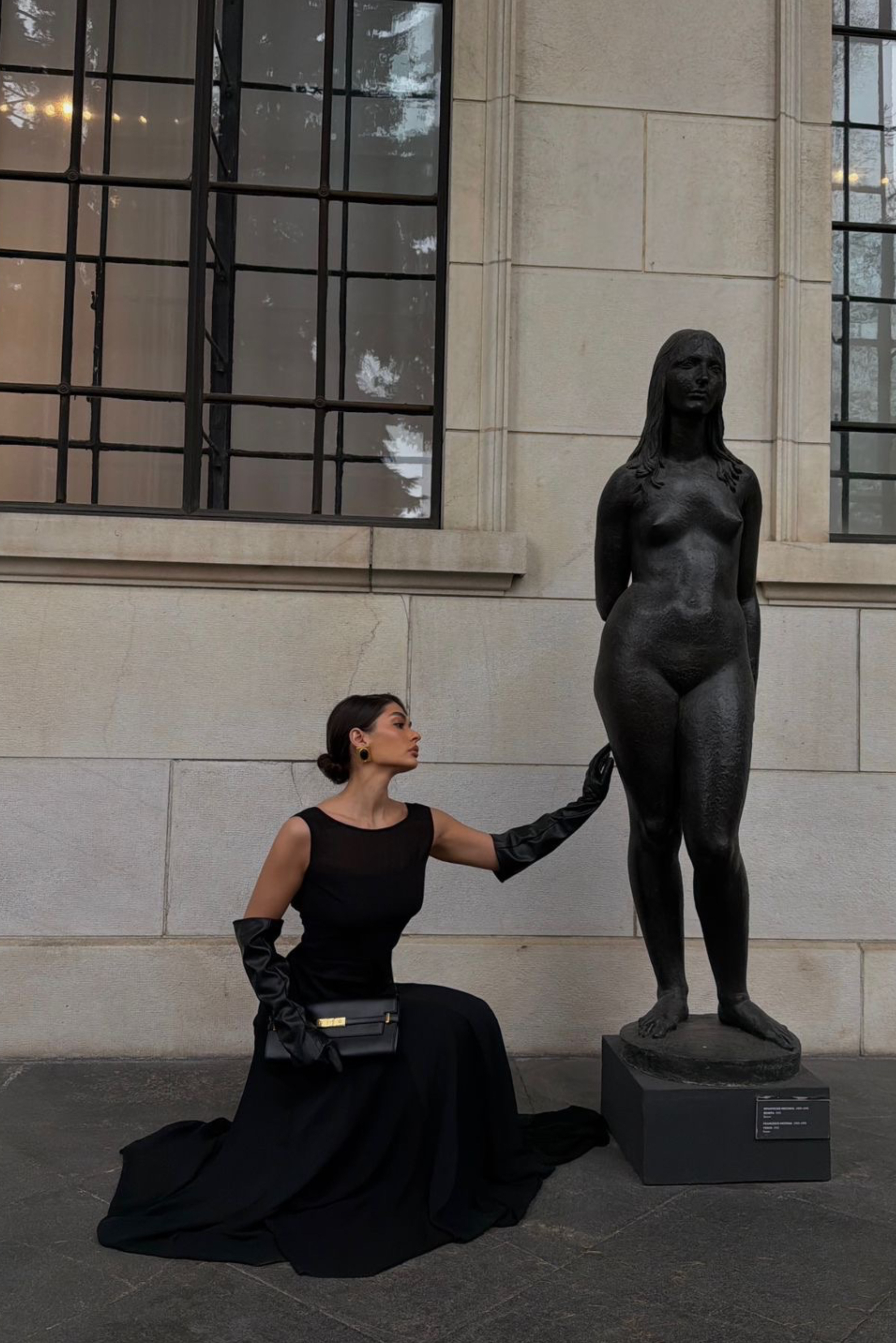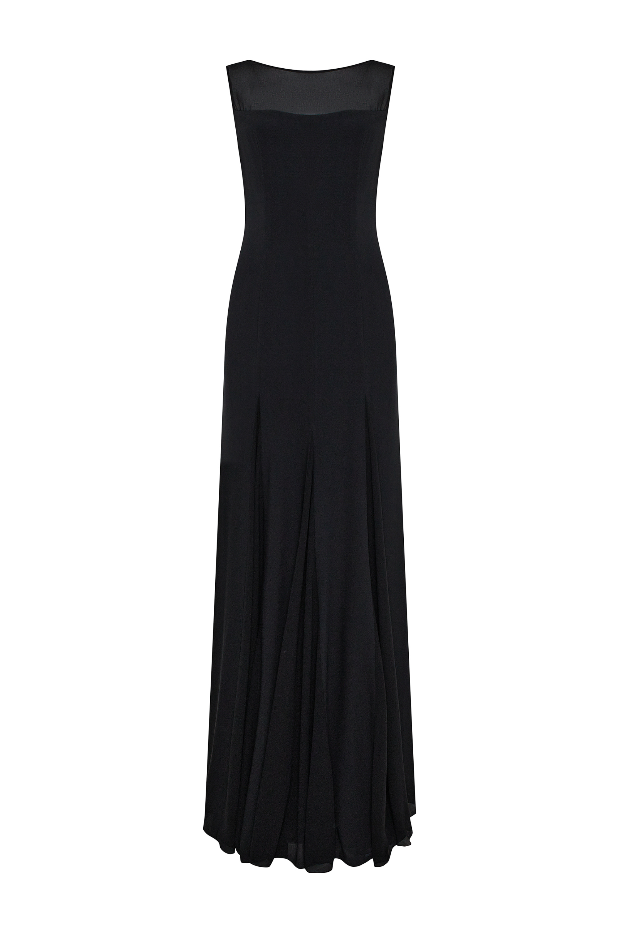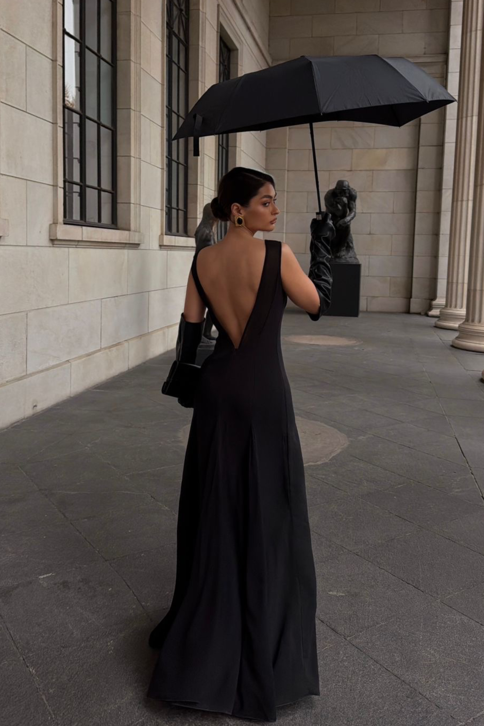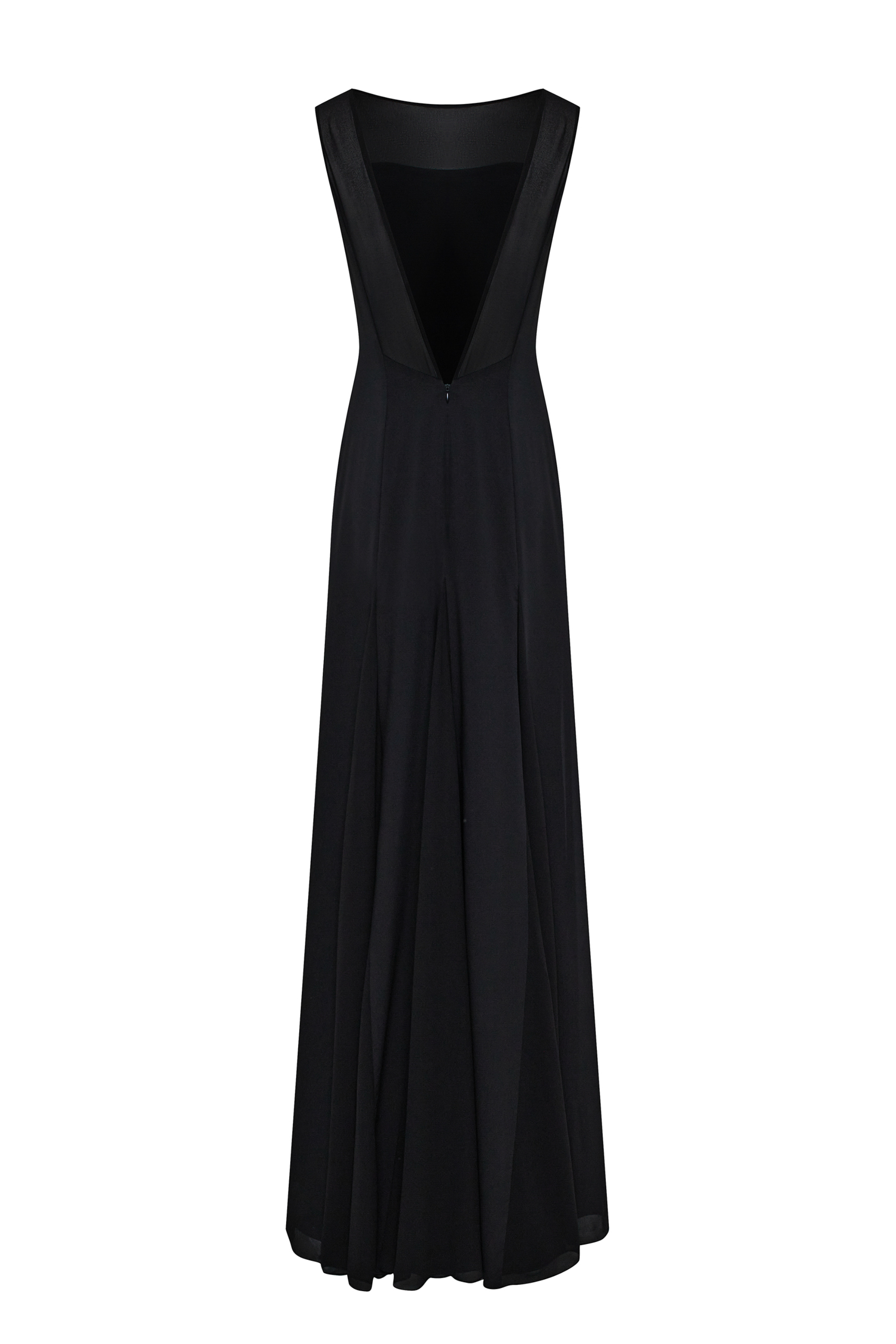 Вечернее чёрное платье в пол с открытой спиной и мягким, струящимся силуэтом. Минималистичное и архитектурное, оно подчёркивает линию тела и создаёт ощущение тишины и внутреннего света. Платье для вечернего выхода, особых событий и камерных встреч.