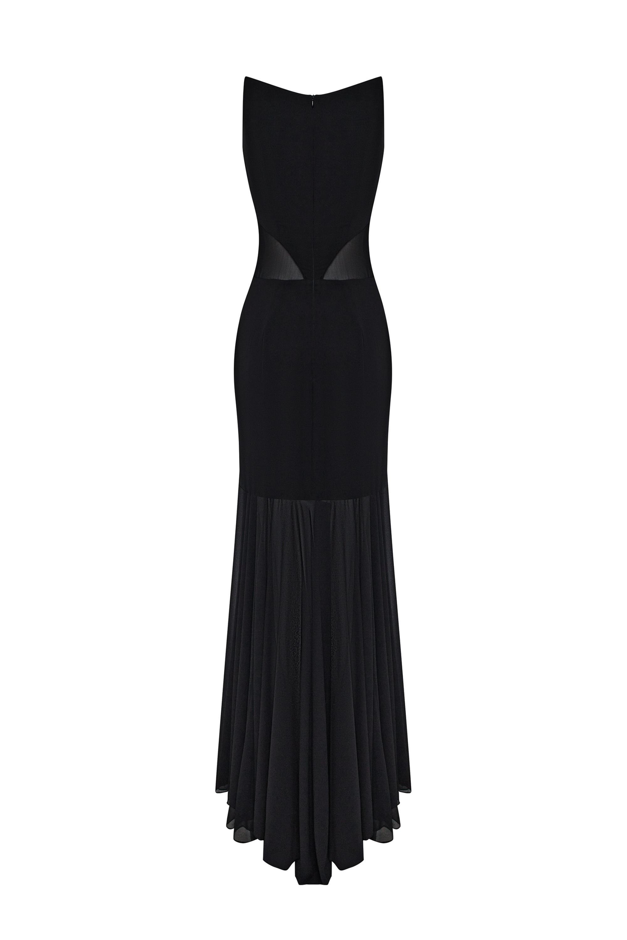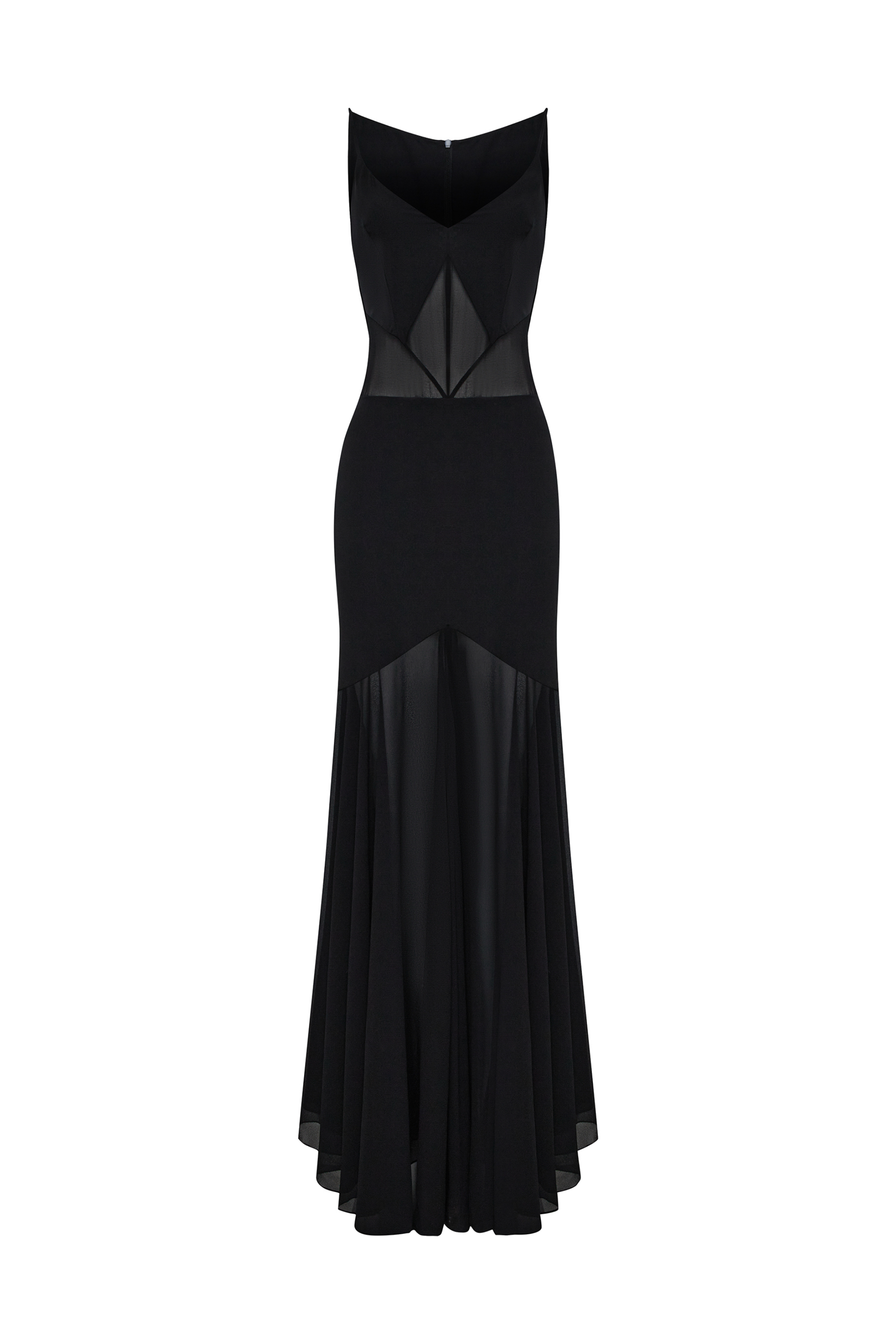 Тонкие бретели, мягко очерченная линия груди и графичные полупрозрачные вставки создают ощущение хрупкой архитектуры. Корсетная линия подчёркивает талию, а струящаяся юбка из воздушного шифона раскрывается при каждом шаге — как дыхание света.