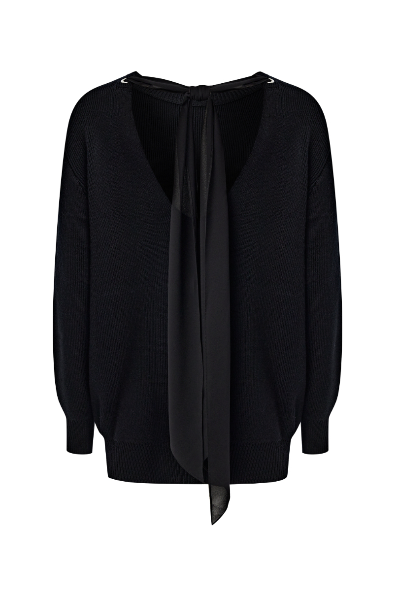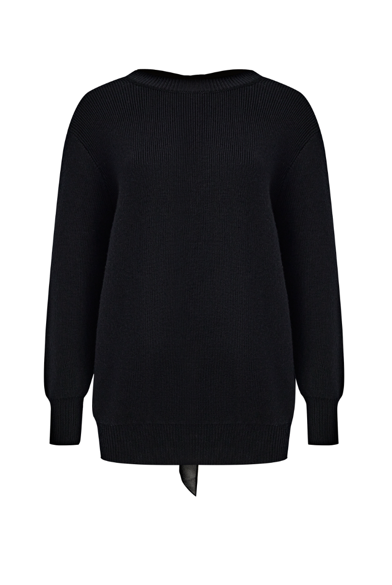 Объёмный джемпер с открытой спиной — игра формы и нежности. Широкий силуэт мягко окутывает, а глубокий вырез на спине добавляет изысканную чувственность и хрупкую смелость образу. Лёгкий шарф из летящего шифона завершает композицию — словно невесомый штрих, который хочется ощущать на коже снова и снова.