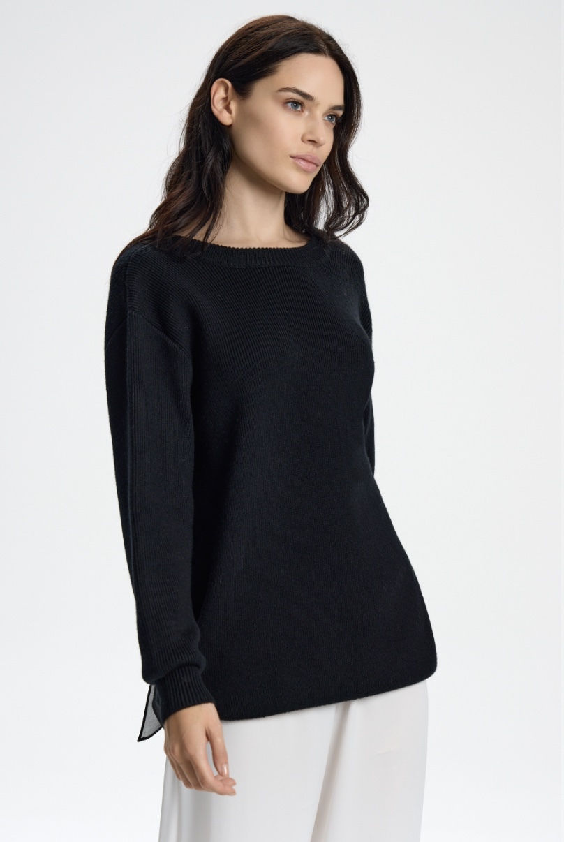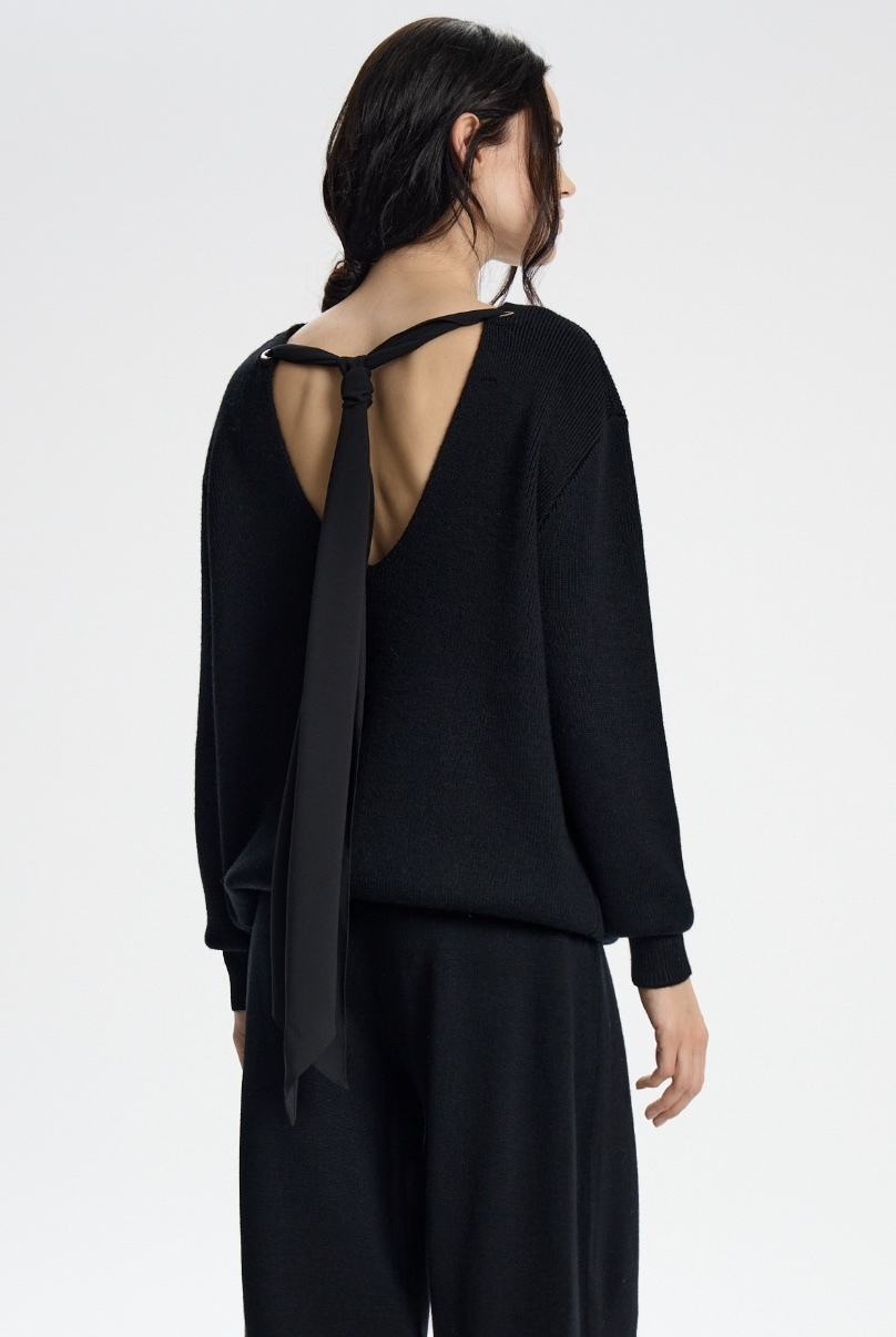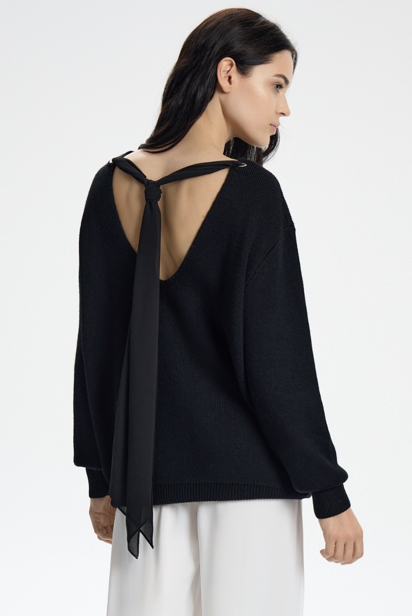Объёмный джемпер с открытой спиной — игра формы и нежности. Широкий силуэт мягко окутывает, а глубокий вырез на спине добавляет изысканную чувственность и хрупкую смелость образу. Лёгкий шарф из летящего шифона завершает композицию — словно невесомый штрих, который хочется ощущать на коже снова и снова.